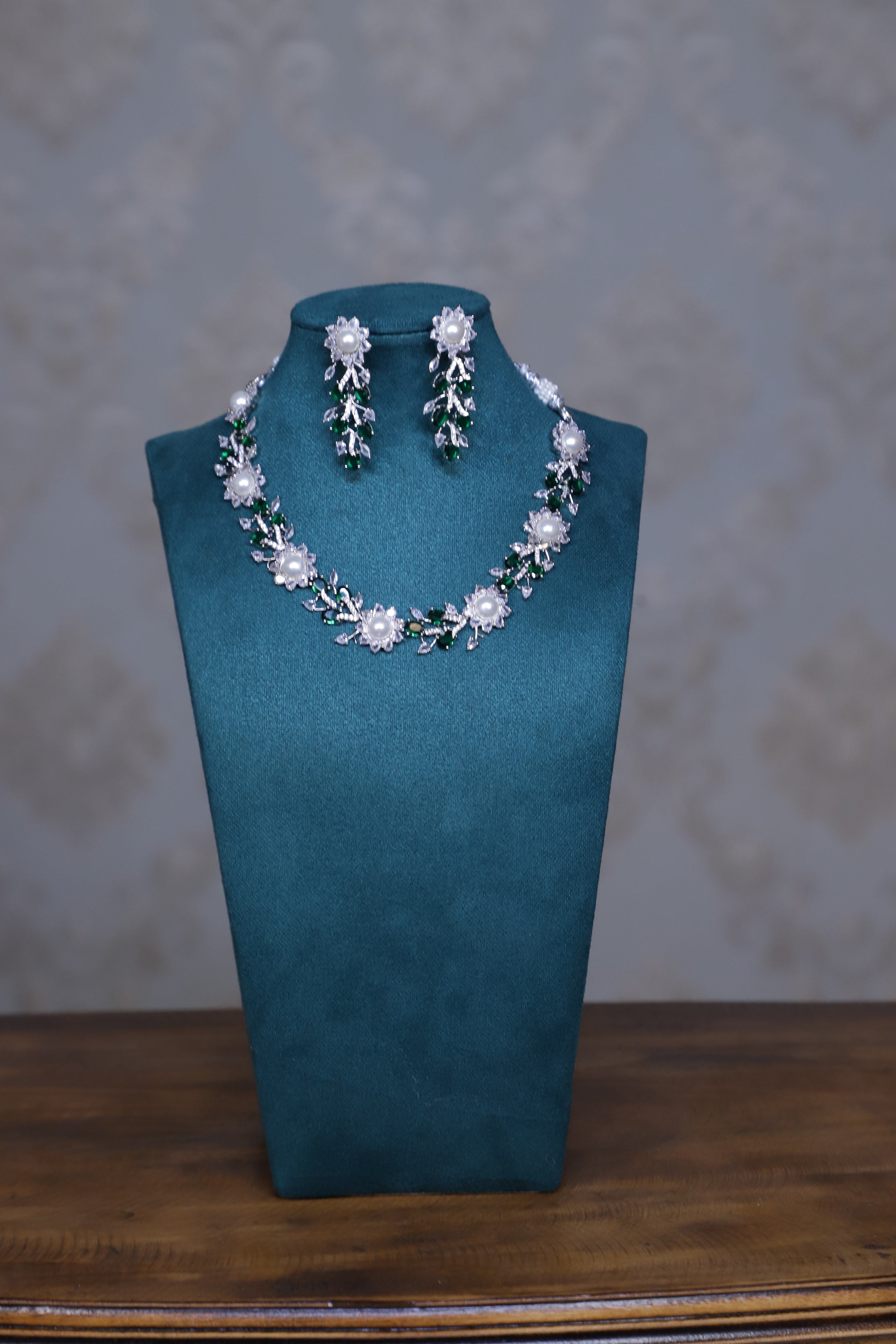 Care Instructions: To maintain the beauty of your Green American Diamond Set with Pearl, avoid exposure to harsh chemicals and store it in a soft, dry place when not in use.