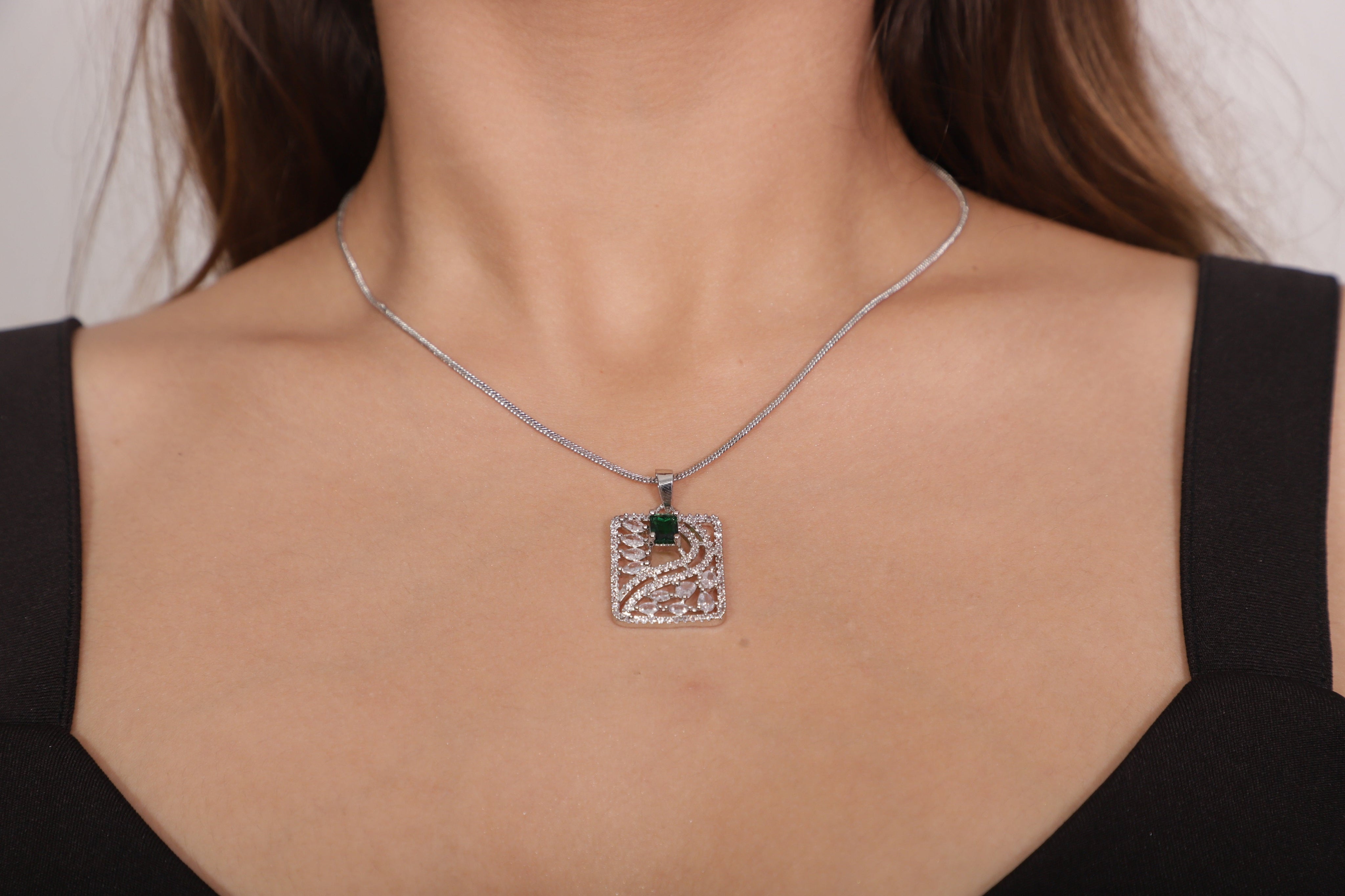 Elevate your elegance with Viora's exquisite Green Stone Pendant Set, featuring a stunning blend of sophistication and sparkle. The centerpiece of this set is a radiant green stone, meticulously cut to capture and reflect light with a mesmerizing brilliance. Complemented by dazzling American diamonds, this pendant exudes timeless glamour and modern allure.